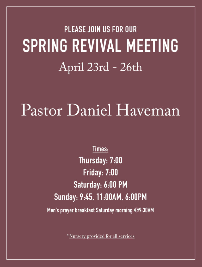 Home SERVICE TIMES: Sunday School: 9:45 AM Sunday Morning Service: 11:00 AM Sunday Evening Service: 6:00 PM Wednesday Prayer Meeting: 7:00 PM